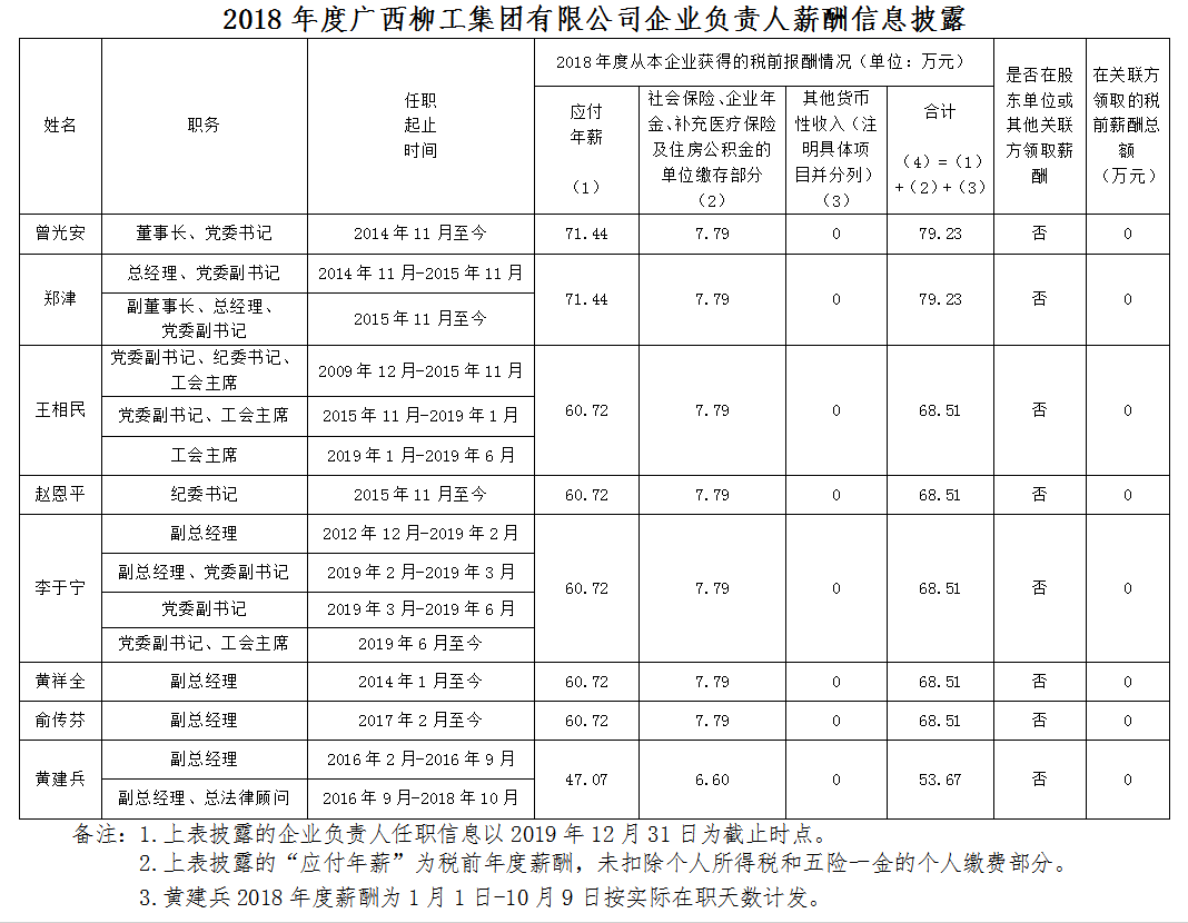 2018年度廣西柳工集團有限公司企業(yè)負責(zé)人薪酬信息披露