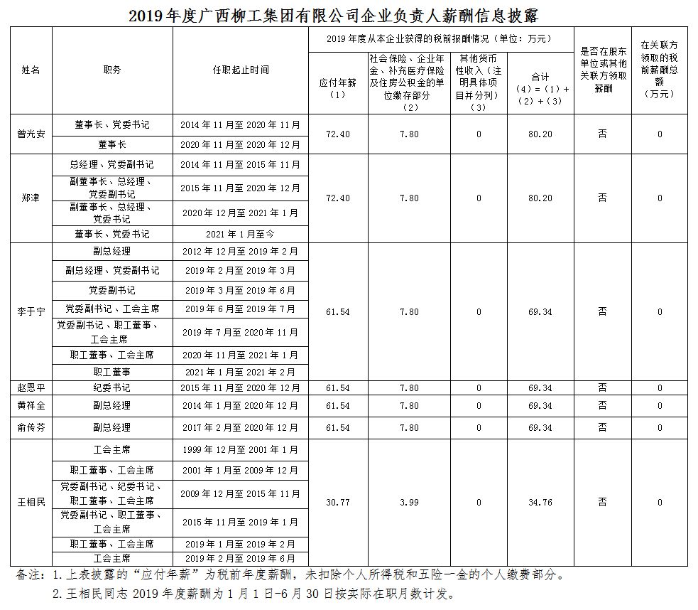 2019年度廣西柳工集團(tuán)有限公司企業(yè)負(fù)責(zé)人薪酬信息披露