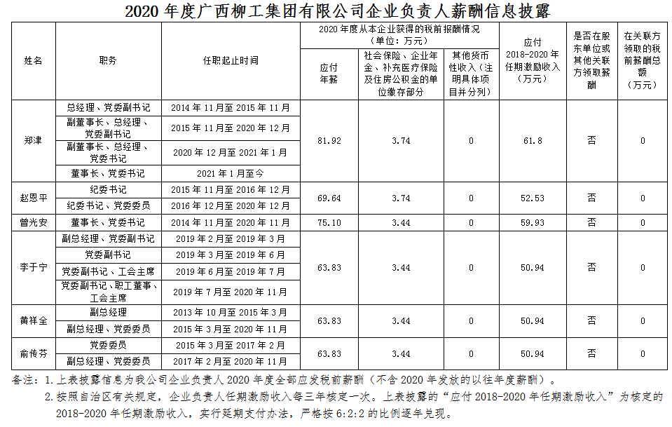 2020年度廣西柳工集團有限公司企業(yè)負(fù)責(zé)人薪酬信息披露