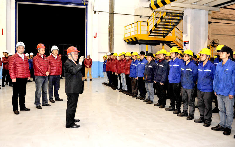 在剛下線的CLG8128H大型裝載機(jī)一側(cè),曾光安與列隊(duì)?wèi)c祝勝利的裝配線員工一一握手,他感謝大家為勝利奪取“1899戰(zhàn)役”付出的辛勤工作。曾光安在講話中高度贊揚(yáng)柳工人是英勇頑強(qiáng)、堅(jiān)不可摧的鋼鐵戰(zhàn)士。他說,“1899戰(zhàn)役”只是個(gè)熱身,2018年我們會(huì)迎來更大的挑戰(zhàn)。他對(duì)裝載機(jī)公司全體員工提出了五個(gè)方面的要求:一是打好新年開門紅的新戰(zhàn)役,為2018年挑戰(zhàn)更高產(chǎn)量目標(biāo)做好充分的準(zhǔn)備。二是努力提升工作效率和降生產(chǎn)運(yùn)營(yíng)管理成本。他說,裝載機(jī)的盈利水平還有很大空間,成本控制是公司的重要工作之一。三是抓好產(chǎn)品質(zhì)量這根主線,2018年我們的產(chǎn)品質(zhì)量在現(xiàn)有基礎(chǔ)上要有更大的改善和提升。四是嚴(yán)把產(chǎn)品交貨期。要吸取2017年因進(jìn)口件及供方配套件不及時(shí)帶來的訂單流失的教訓(xùn),在保證產(chǎn)品質(zhì)量的同時(shí),嚴(yán)格按客戶指定的時(shí)間交貨,真正體現(xiàn)柳工是一家高質(zhì)量、高水平、高誠(chéng)信的制造企業(yè)。五是努力打造一支懂管理、懂技術(shù)的年輕管理者人才隊(duì)伍,同時(shí)要重點(diǎn)培養(yǎng)生產(chǎn)一線員工中的大師級(jí)人才隊(duì)伍,讓年輕的新生力量成為有想法、有闖勁、勇?lián)?dāng)?shù)募夹g(shù)型工人隊(duì)伍。