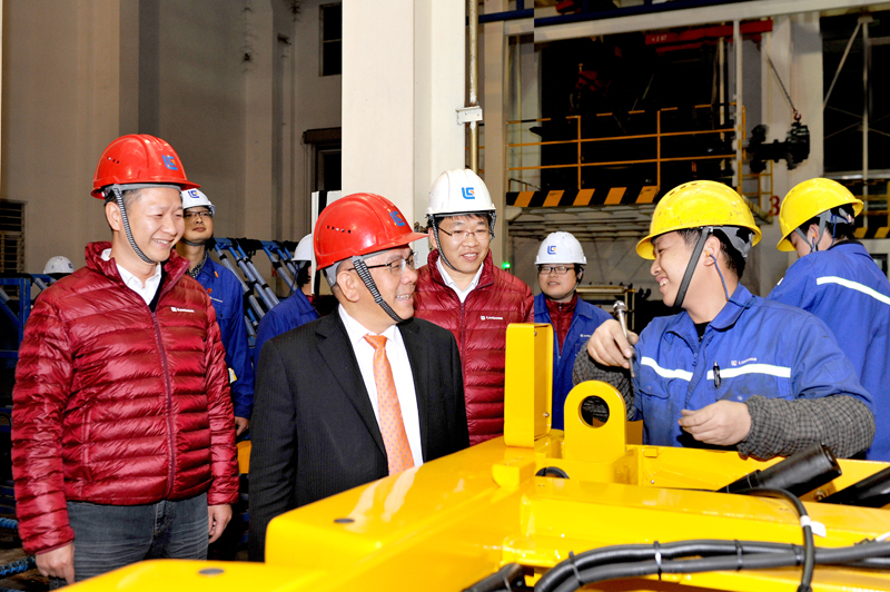 2017年12月29日晚九時(shí)三十分,當(dāng)月第1899臺(tái)裝載機(jī)在裝載機(jī)公司裝配工廠順利下地,裝配現(xiàn)場(chǎng)無不歡聲雷動(dòng)。這預(yù)示公司全面奪取了“1899戰(zhàn)役”的勝利。曾光安、黃海波等公司領(lǐng)導(dǎo)以及股司相關(guān)職能部門的負(fù)責(zé)人連夜前往裝配工廠祝賀,并親切看望和慰問在裝配線的全體“將士”(如下圖)。
