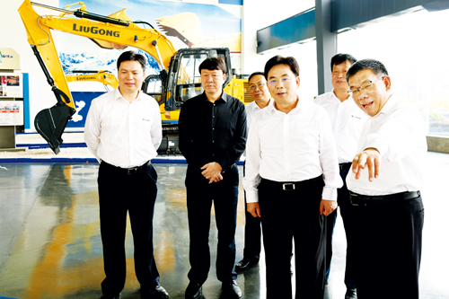 曾光安(右一)為黃海龍(右二)一行介紹柳工產(chǎn)品