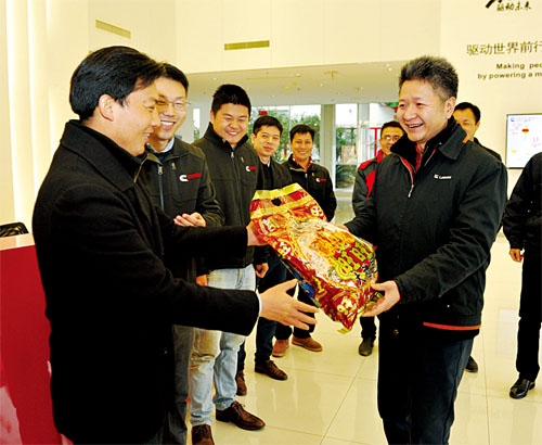 裝載機公司的員工們準時回到工作崗位,抖擻精神,開啟新一年的征程。公司黨委書記、董事長曾光安等領導為到崗的員工送上了新春祝福。員工們臉上洋溢著濃濃的春意,嘴角掛著幸福的微笑,從公司領導手中接過新春慰問品的同時,也接收了新的指令。